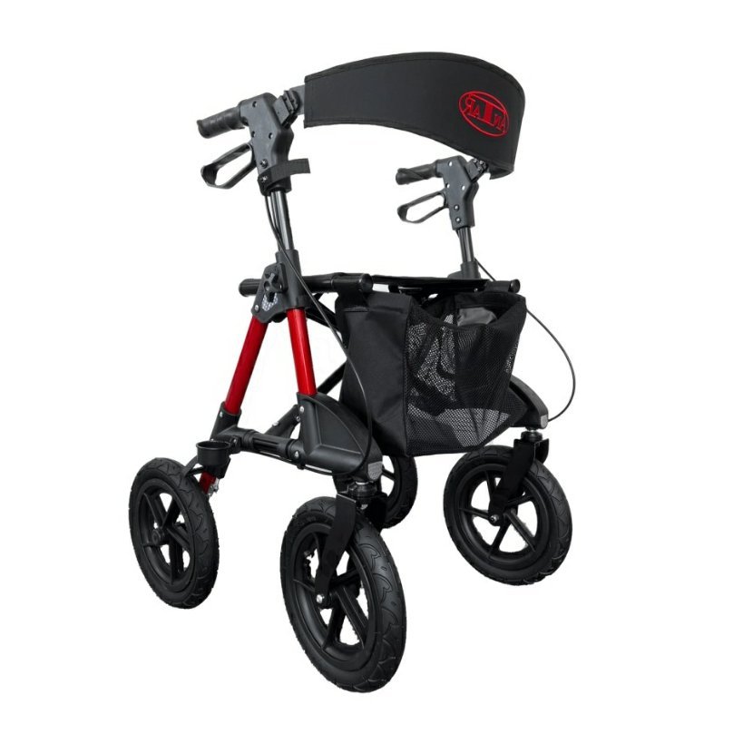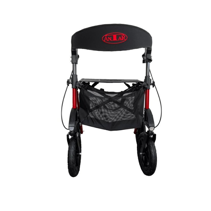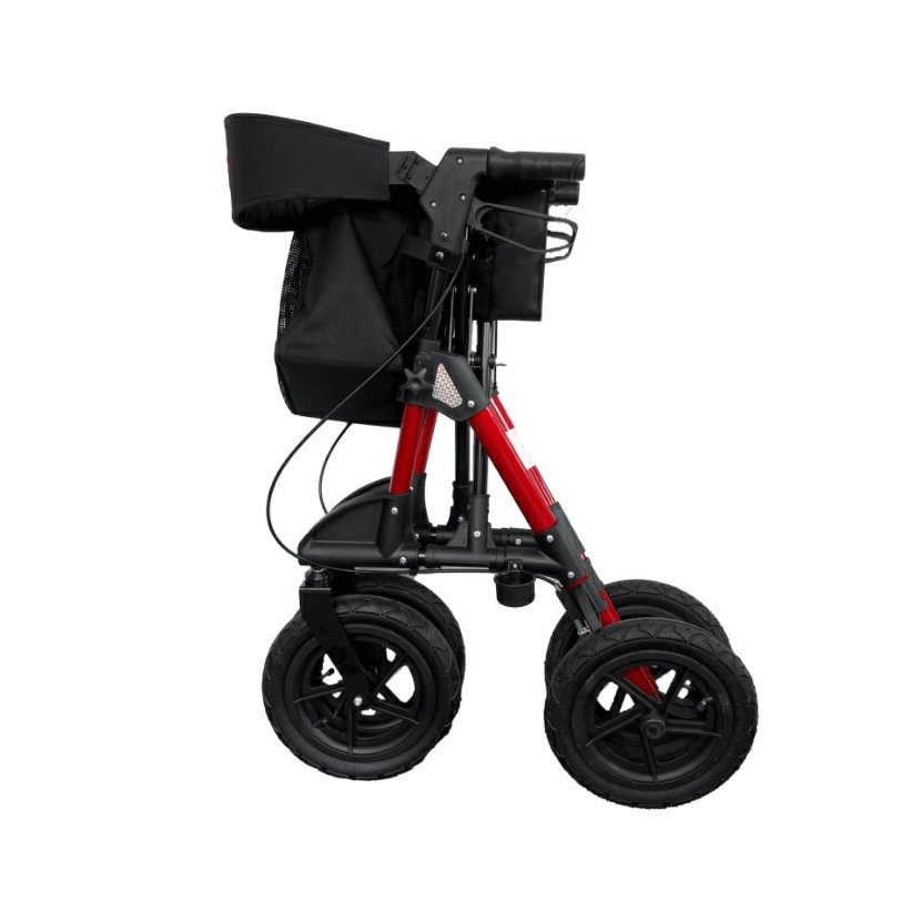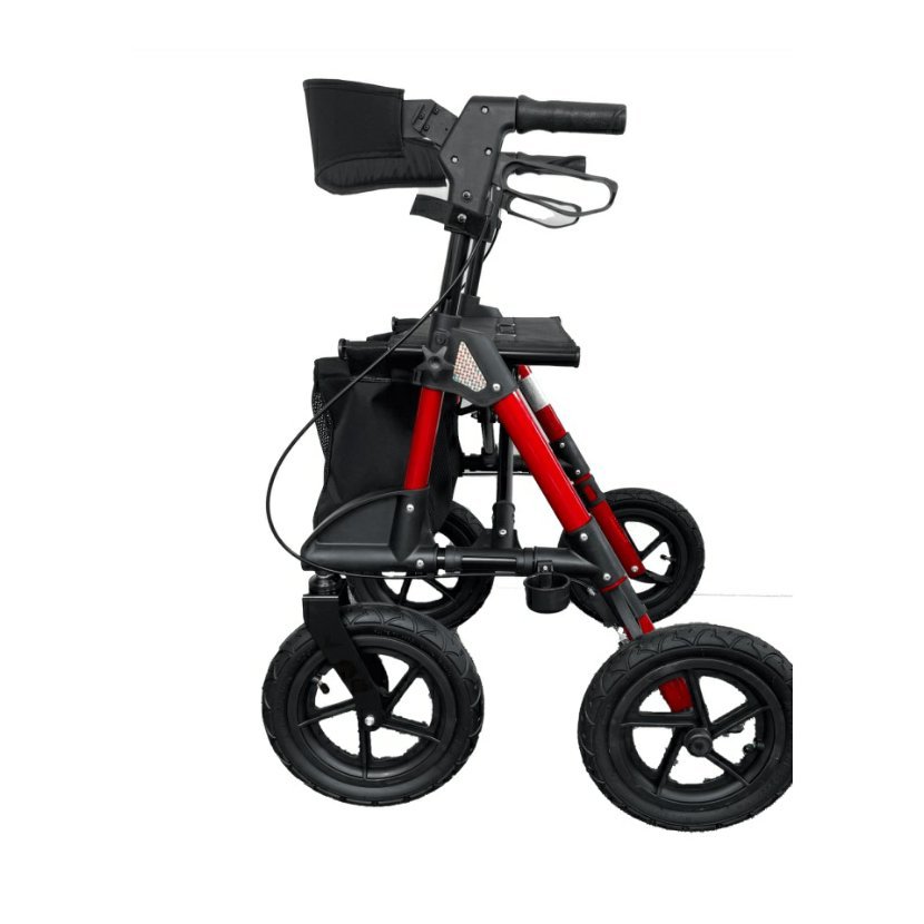 Odlehčené čtyřkolové chodítko v červené barvě je ideální pro seniory a osoby s omezenou pohyblivostí. Díky nafukovacím kolům poskytuje maximální komfort i na nerovném povrchu. Je vybavené pohodlným sedátkem s opěrkou, odnímatelnou taškou a brzdami na rukojetích pro bezpečnou chůzi.