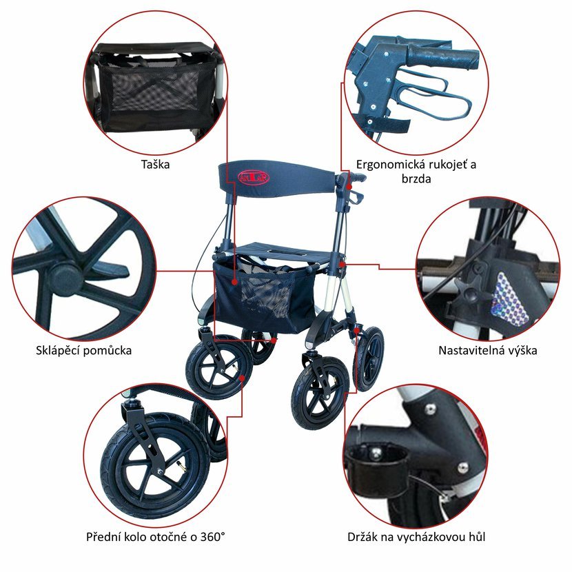 Odlehčené čtyřkolové chodítko pro seniory s nafukovacími koly, nastavitelnou výškou a praktickým košíkem. Stabilní, pohodlné a ideální pro seniory i rehabilitaci.