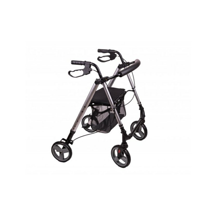 Ultralehké chodítko vhodné i pro vysoké uživatele, lehký hliníkový rám, výškově nastavitelné sedátko i rukojeti, parkovací brzy, taška. Váha 7 kg, nosnost až 136 kg.