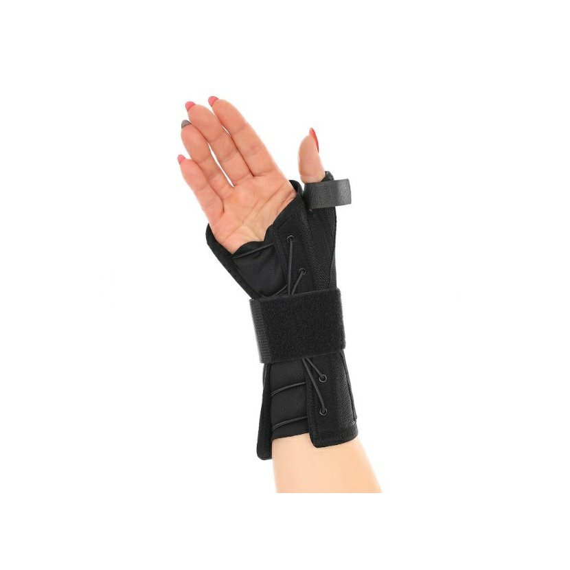 Ortéza zápěstí se stahujícím gumičkami a kovovými dlahami poskytuje větší stabilizaci díky přídavnému popruhu. Systém stahovacích gum, po celé délce ortézy, jednoduše ortézu na zápěstí zafixuje tak, aby neškrtila. Ortéza má v sobě dvě kovové dlahy, které se dají v případě potřeby odebrat. Palec ruky je fixován pomocí suchého zipu. Navrženo pro stabilizaci zápěstí a palce. Ortéza je pohodlná a jistě oceníte praktické zapínání. Tkanina z polyamidového mikrovlákna zajištuje lepší proudění vzduchu. INDIKACE/POUŽITÍ - Syndrom karpálního tunelu - De Quervainova tenosynovitida - Podráždění CMC a MCP kloubů - Podvrtnutí palce. - Pooperační ošetření a ochrana před úrazy