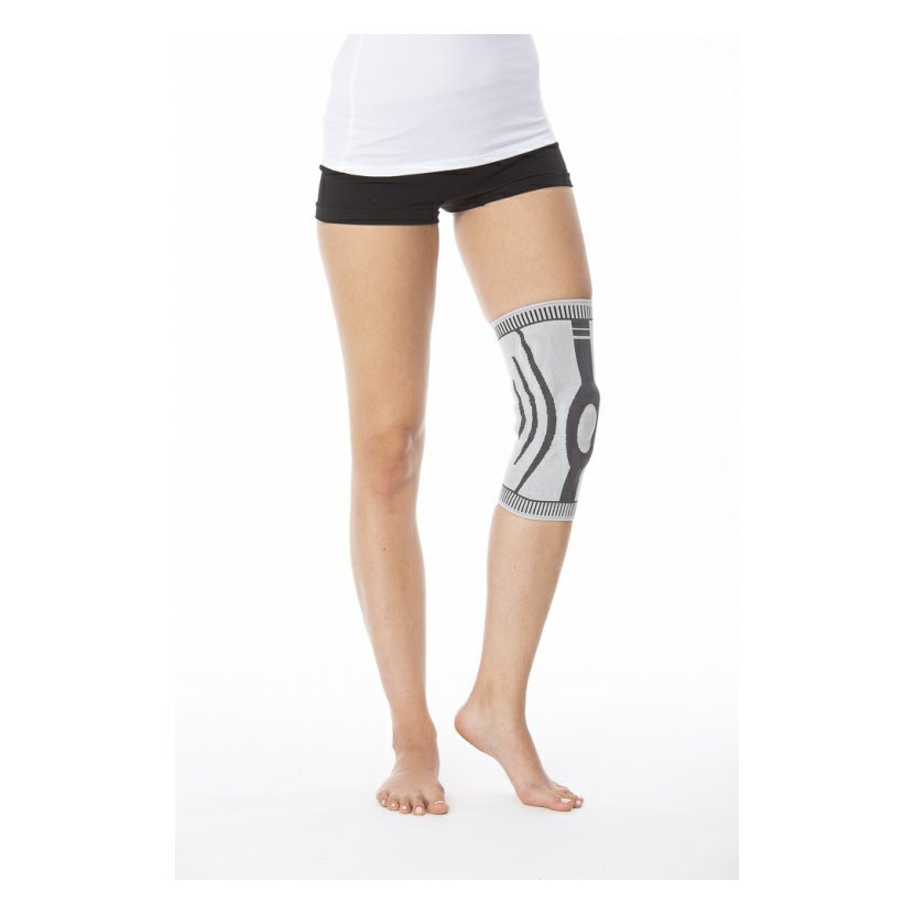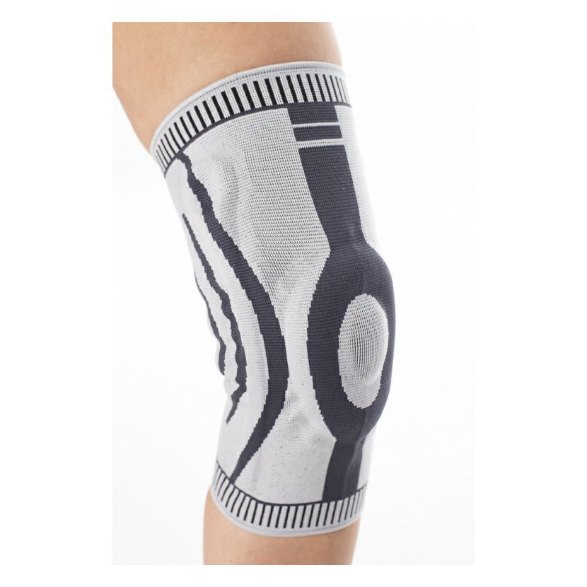 Ortéza na koleno se spirálovými bočními výztuhami a silikonovou výztuží pro čéšku vyrobená ze vzdušné textilie posiluje kloub, zajišťuje kompresi, stabilizaci a mírně ohřívá kolenní kloub.