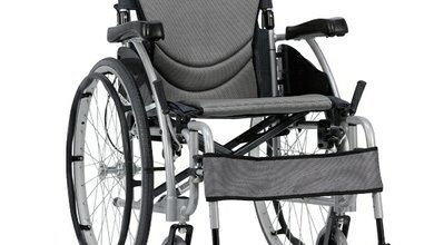 Odlehčený invalidní vozík S-ERGO 115 o váze 13,5 kg s rychloupínacími zadními koly, sklopnou opěrkou, parkovacími brzdami a odnímatelnými stabilizačními kolečky a parkovací brzdou + brzdou pro…