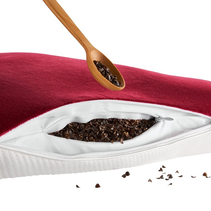 Polštář je naplněn 100% organickými pohankovými slupkami, které zajišťují dobrou cirkulaci vzduchu, odvádějí vlhkost a pomáhají udržovat hygienické prostředí při spánku. Výplň lze přizpůsobit – přidáním nebo odebráním slupek si nastavíte ideální tvrdost i výšku polštáře.